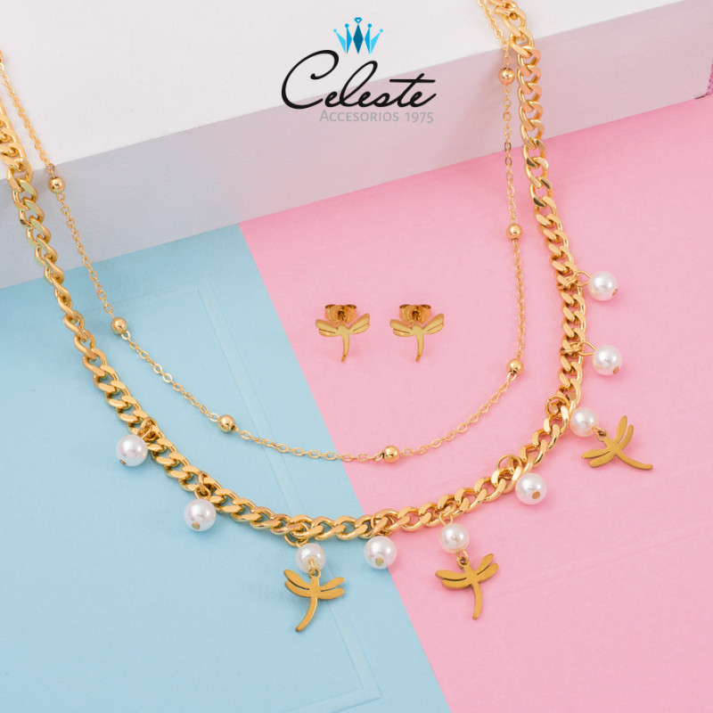 J869 - JUEGO ACERO LIBELULAS Y PERLAS CADENA ANCHA 2 VUELTAS