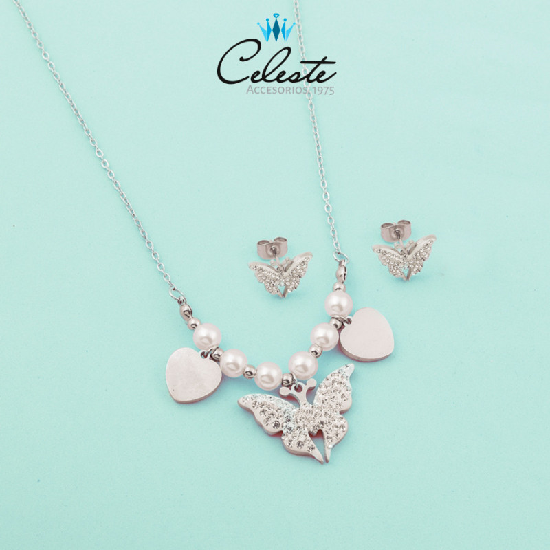 JUEGO ACERO MARIPOSAS EN MICROZIRCONES PERLAS Y CORAZONES