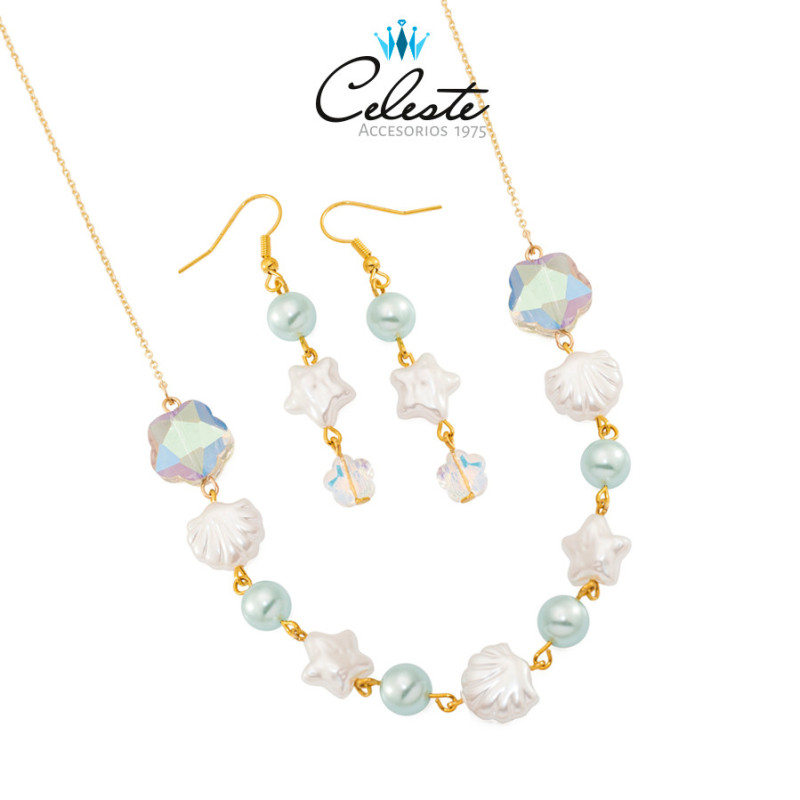 JUEGO ACERO COLLAR PERLAS CONCHAS Y ESTRELLAS DE MAR