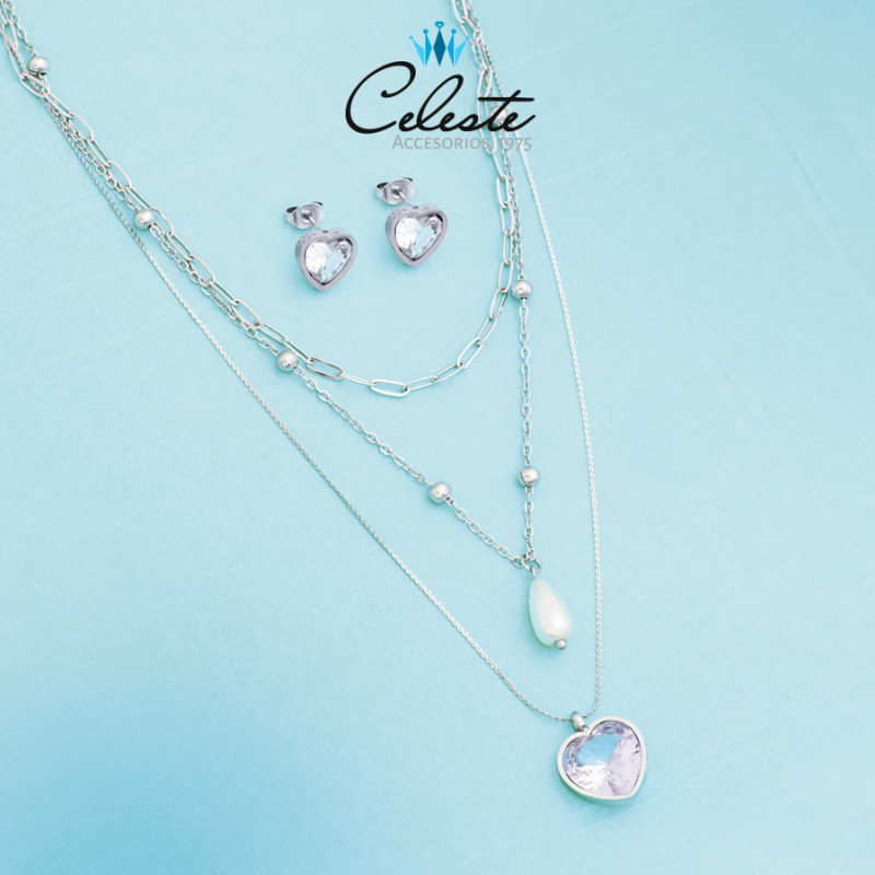 JUEGO ACERO CORAZON DE ZIRCON PERLA LAGRIMA