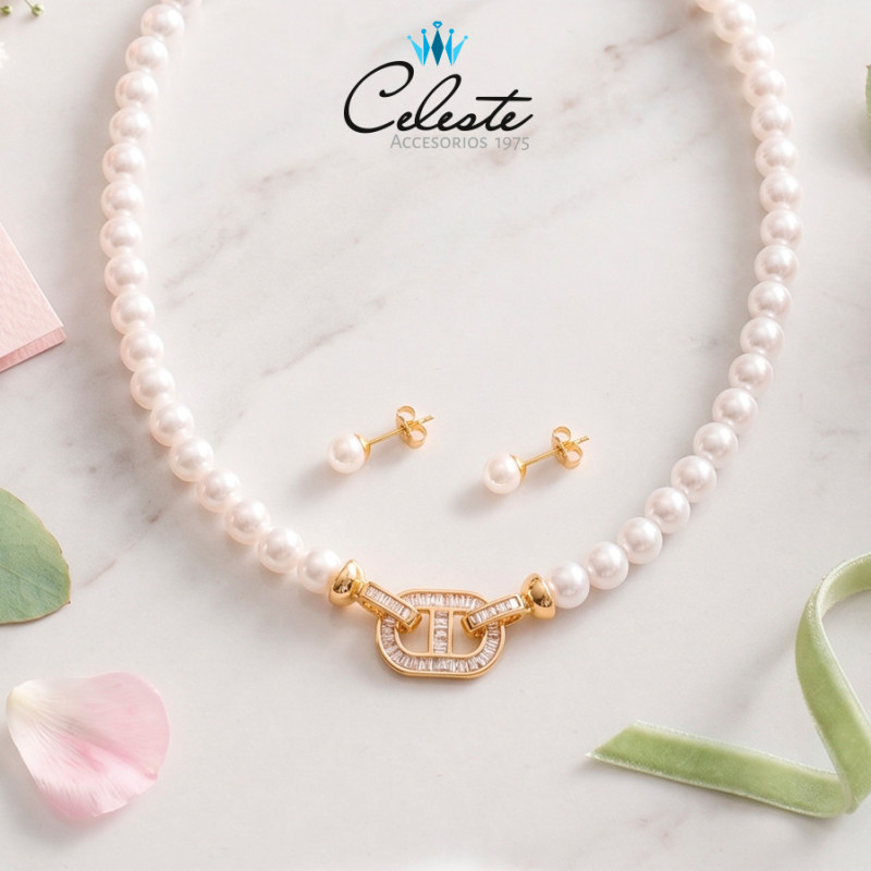 J1140 - JUEGO ACERO CADENAS DOBLES PERLAS Y...