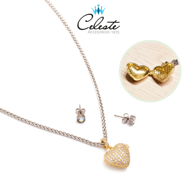 JUEGO BICOLOR CORAZON RELICARIO EN MICROZIRCONES