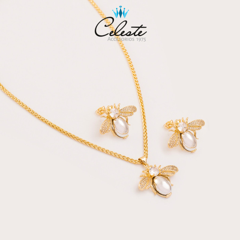 J2084 - JUEGO ABEJA REINA BICOLOR EN MICROZIRCONES CADENA ESPECIAL, RODIO